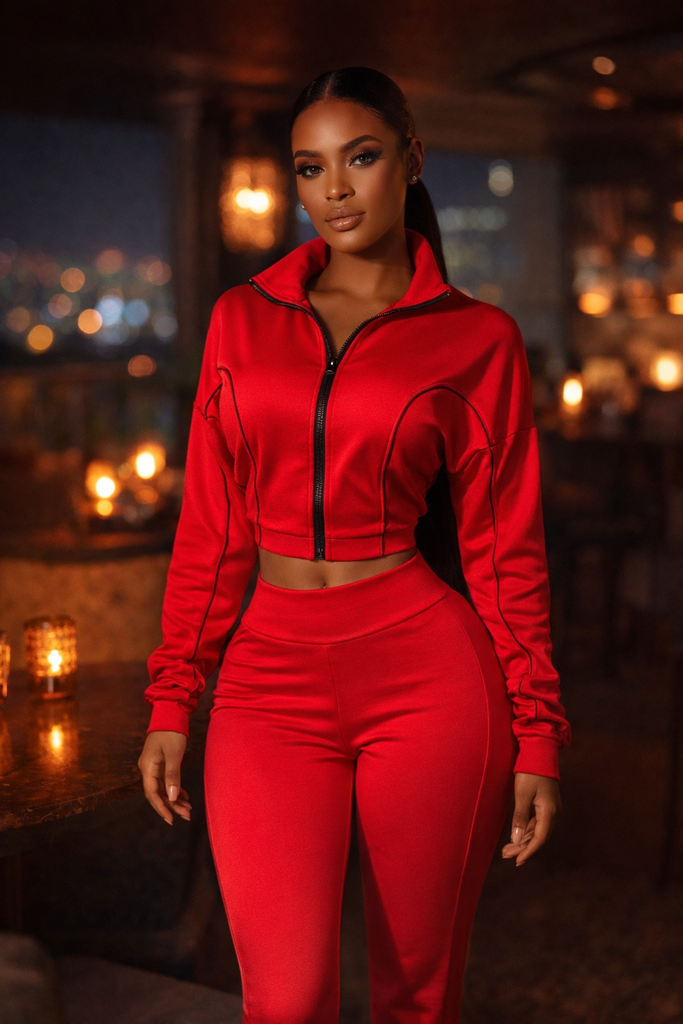 Crafted in a rich crimson hue, the cropped zip-front jacket contours the waist while the sleek black zipper adds a striking contrast that amplifies its high-fashion appeal. The high-waisted pants hug every curve flawlessly, creating a smooth, elongated silhouette that transitions effortlessly from daytime power moves to nighttime takeover.