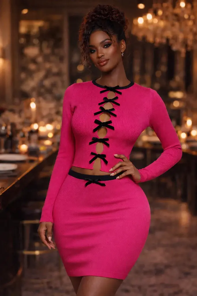 Step into soft power with the Boss Set, a statement two-piece designed for women who balance femininity with authority. Crafted from premium ribbed stretch fabric, this set features a long-sleeve fitted top with eye-catching bow-accent cutouts, paired with a high-waisted, curve-hugging skirt that sculpts the body effortlessly.